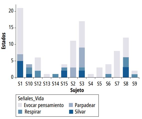De acuerdo con los datos presentados en la figura 4, la señal llamada “Evocar Pensamiento” es la más común. Durante la interacción, el sujeto transita por dos escenarios: efecto novedad y luego, interés por solucionar el problema o juego propuesto. El segundo escenario considera dos aspectos: primero, la activación de las señales de vida está en función de la trayectoria de solución del problema del sujeto y las emociones presentadas; segundo, las señales de vida son reconocidas o ignoradas, conforme a el nivel de concentración que se evidencia en el sujeto. Aunque el reconocimiento de las señales es útil para acentuar el reconocimiento de la herramienta como agente, también causa distracción durante la solución del problema y es reconocida, de manera equivocada, por los sujetos como instrumento de retroalimentación acerca de la solución. De manera análoga a los recursos humanos para interactuar, el robot está dotado con sonidos, movimientos, palabras y una pantalla que representa el rostro del robot. Aunque el rostro es considerado el punto de confluencia emocional e instrumento semiótico para complementar el lenguaje verbal y no verbal, lo que se evidencia en la mayoría de los sujetos es la tendencia a ignorar la pantalla del robot en tanto el foco de atención está en el tablero del juego. Entonces, cambiar el punto de atención del tablero de juego a la pantalla del robot u otra dirección implica abandonar la representación mental del juego, la cual es utilizada en la construcción de secuencias de movimientos para resolverlo.