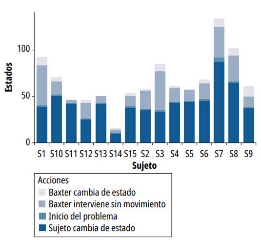 A pesar del interés dominante de ver en acción al robot, hay una mayor intervención de los sujetos durante la solución del problema (Figura 5). Al comparar las acciones del robot entre las acciones que intervienen con movimiento y sin movimiento de fichas, son menores las acciones del robot con movimiento.