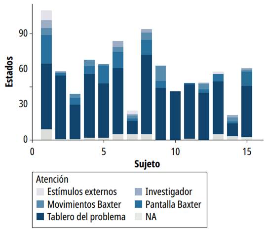 Durante la interacción, el foco de atención dominante es el tablero del problema. Una de las razones es la exigencia cognitiva que implica la representación mental del problema. Aunque la agencia de la herramienta de aprendizaje (robot) se materializa mediante señales de vida, intervenciones sin movimiento e intervenciones con movimiento; los sujetos tienen a no desviar la atención al tablero debido al riesgo que representa perder la secuencia de representaciones de estados (Ver figura 6).