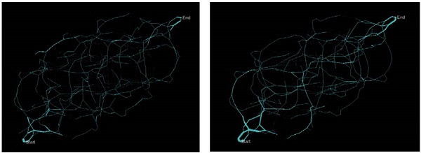 La figura 7 es una representación del espacio del problema; es decir, todos los estados posibles del juego. El espacio del problema está compuesto por Nodos y Aristas. Los Nodos indican cada una de las combinaciones de las fichas del juego y las Aristas indican la relación entre Nodos. De otra parte, las líneas de color azul representan las trayectorias realizadas por los sujetos y el ancho de cada línea indica la frecuencia de visita en cada arista. Al comparar ambas figuras, es evidente que el proceso de solución del problema acompañado de la herramienta con agentividad tiene un impacto positivo en la exploración del espacio del problema y de la correspondiente solución.