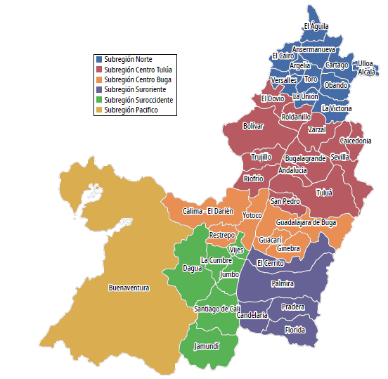 The 56 institutions at high risk increased to 83%, from 8 in 2011 to 13 in 2012. In addition, 63% of the NSES are categorized as medium risk, from 6 in 2011 to 11 the following year [12]. Regarding low complexity centers, of 33 institutions without risk, five became high-risk, five became medium-risk, five became low-risk, and only 18 remained without risk [12]. Once the calculation for 2013 had been performed for all institutions, financial deterioration occurred. In 2012, the Hospital Universitario del Valle (HUV) went from medium to high risk. Three medium-complex NSEs were the same: Mario Correa Rengifo, San Antonio de Roldanillo, and San Rafael de Zarzal [12]. SDSVC should identify the current situation of HS in each zone. The design should incorporate low-complexity services for all citizens at work, school, home, and region. In addition, the services of high, medium, and low complexity performed by NSEs must maintain a long-term financial balance [8]. The extension of the valley and subregions is worth noting, as shown in Figure 2.