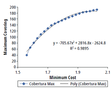 The OF for maximizing coverage is considered a constraint. Thus, the minimum cost of the network is obtained and yields a coefficient of performance (COP) of 1.55989e+11. Next, the OF for minimizing costs is entered as a restriction and is limited to the maximum value found in the previous step, 1.55989e+11 COP. Then, the model considers the OF to maximize coverage, which provides 40 open services.