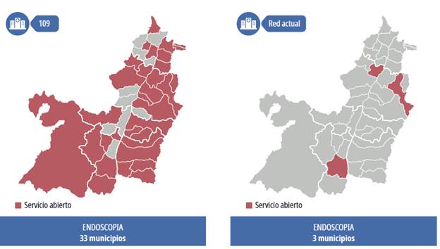 In the case of endoscopy and blood transfusion services, there are differences between the proposal and the current network. The model against the number of recent referrals determines the services opening by minimizing costs and maximizing coverage. The difference is understood when considering that the price of opening the endoscopy service is only 24% and 8% lower than that of the high-complexity surgery service.