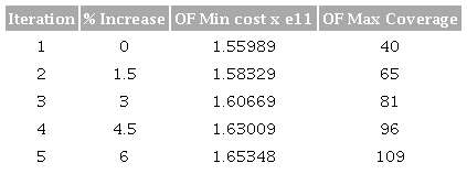From a social perspective, the best solution has more excellent coverage. Therefore, the closest result to the equivalent solution is obtained in iteration 5, where the open services number 109 at a budget increase of only 6%.
