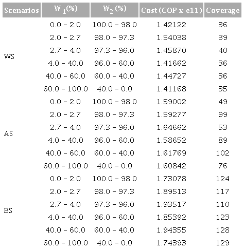 The values of the demands are obtained by considering the confidence interval within a normal distribution. In particular, the lower limit of the interval for each parameter is equal to the worst scenario's value. The upper limit of the interval is equivalent to the best scenario, and the average values correspond to the values for the average scenario. Note that we have used a weighted method for generating the sensitivity analysis. In particular, we have varied the values of W1 (weight of the cost function) and W2 (weight of the coverage function). Note that W1 and W2 define the importance of the objective function. Table 2 shows the obtained results for the considered scenarios.