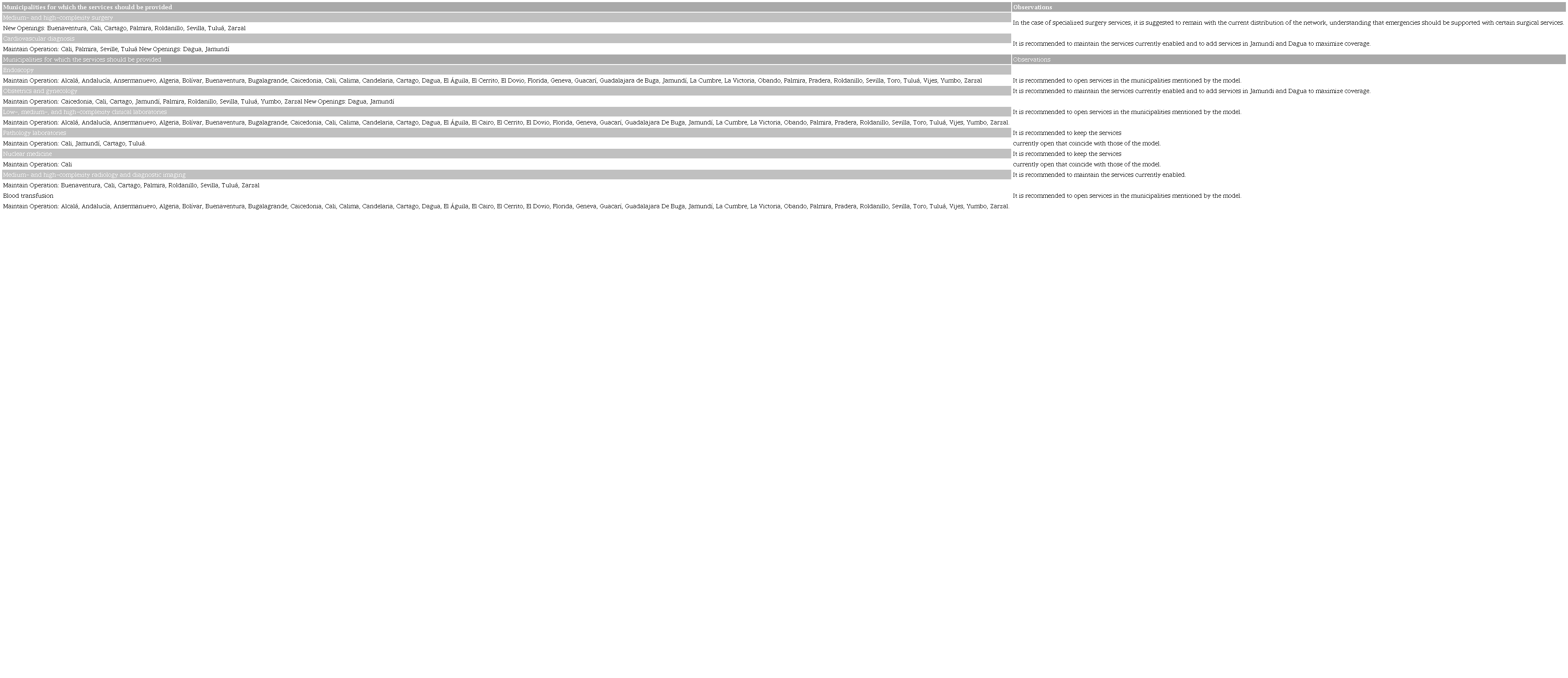 Once the results of the model and the distribution of services of the current network are analyzed, the service proposal is based on improving access and quality in the provision of services, avoiding duplication of supply, and generating an impact on the network's sustainability of Valle del Cauca. In Table 4, a set of recommendations obtained from the model is presented.