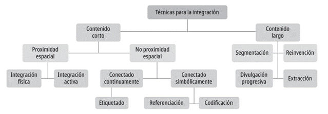 En este estudio, a partir de la información recabada, se propone una taxonomía de técnicas para la integración de contenido fundamentada en su extensión, un factor considerado fundamental, dado que incrementa la necesidad de usar recursos cognitivos en la memoria de trabajo durante el desarrollo de la actividad. En el proceso, no se identificaron taxonomías similares. De igual forma, conscientes de las limitaciones de las técnicas basadas en la proximidad espacial, se propone la categoría de “no proximidad espacial”, para agrupar técnicas que tienen un efecto similar o superior en el esfuerzo mental y el desempeño. Asimismo, se plantea la categoría de “contenido largo”, que agrupa técnicas para segmentar el contenido y lograr espacios de información que no estén sobrecargados, aprovechando mejor los recursos cognitivos del estudiante.