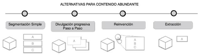 Divulgación progresiva: usada para dividir el contenido en unidades más pequeñas y administrarlo progresivamente bajo demanda del usuario [40], [47].