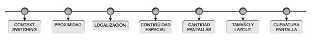 La proximidad física, que permitió identificar similitudes con la contigüidad espacial, dada su dependencia de la distancia entre espacios de información, por lo cual se considera que pueden constituir una única característica a abordar. De igual forma, el efecto cognitivo es similar, dado que se incrementa el uso de la memoria de trabajo debido a la separación de las fuentes de información [76], algo que afecta el desempeño del usuario.