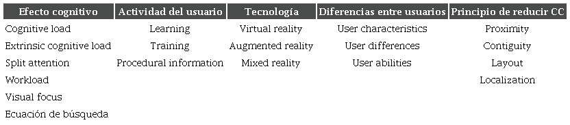 Habilidad espacial (HE): con base en la teoría de la carga cognitiva, varios estudios en diversos campos han intentado confirmar o desmentir el supuesto de que los usuarios con alta HE pueden manejar mejor su exposición a un estímulo visualmente complejo y mantener un nivel de esfuerzo mental bajo, en comparación con los usuarios que poseen HE baja [22], [23], [24], [25], [26], [27]. [28], [29]. En la tabla 2 se relacionan los principales efectos en el esfuerzo mental y el desempeño.