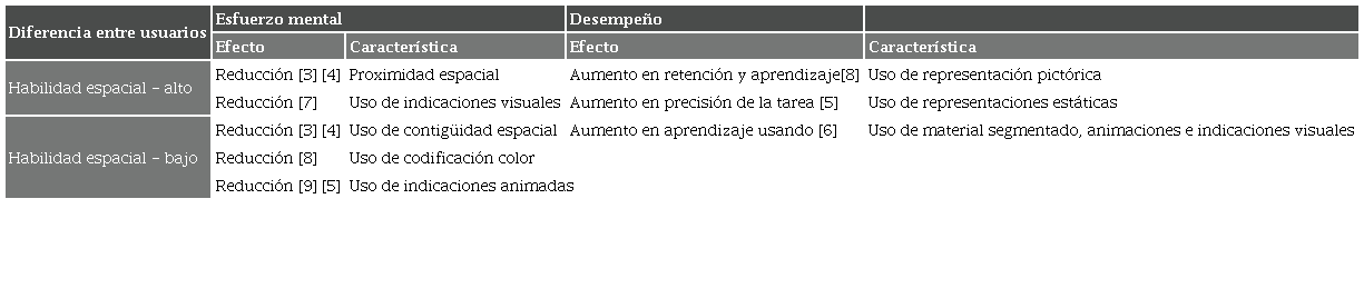 Con respecto a las diferencias entre usuarios, se identificó la influencia de factores individuales como la habilidad espacial, el conocimiento previo y la memoria de trabajo visual. En este sentido, son varias las apreciaciones: primero, efectivamente varios estudios han podido reafirmar que la habilidad espacial alta brinda a la persona la capacidad de gestionar eficientemente su memoria de trabajo visual, a fin de evitar la sobrecarga cognitiva cuando aprende con materiales de alto contenido visual [23], [24]. Al parecer, ciertos formatos (integrados) [23], segmentados y con características de animación [25] y de codificación [27] son especialmente útiles para personas con baja capacidad espacial, principalmente porque ayudan a reducir el procesamiento extraño, manteniendo recursos cognitivos disponibles para el procesamiento pertinente [29], lo cual permitió a los estudiantes aumentar la comprensión y nivelar su conocimiento. Sin embargo, para personas con capacidad espacial alta, estas características no brindan un apoyo adicional y relevante [23]. Por lo tanto, se identifica que las personas con menor capacidad espacial requieren y obtienen mejores resultados aplicando estrategias para la reducción del procesamiento extraño [27].