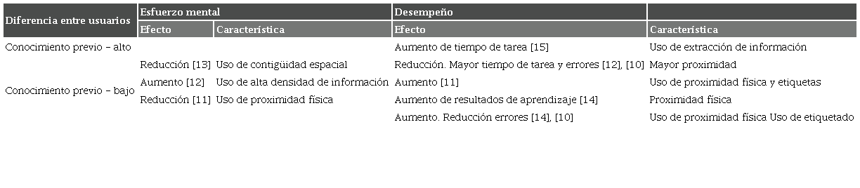 Conocimiento previo (CP): el CP influye de varias formas, sobre todo en la eficacia del formato de integrado [30], lo cual es especialmente más útil para los estudiantes con CP bajo [16], [31], ya que evita los cambios de atención que se generan en la búsqueda de información. Finalmente, se evidencia que el bajo CP puede definir aspectos como la necesidad de integración espacial de información, un mayor tiempo para el desarrollo de la tarea, e indicadores visuales que reduzcan la búsqueda de información [32], [33], entre otros.