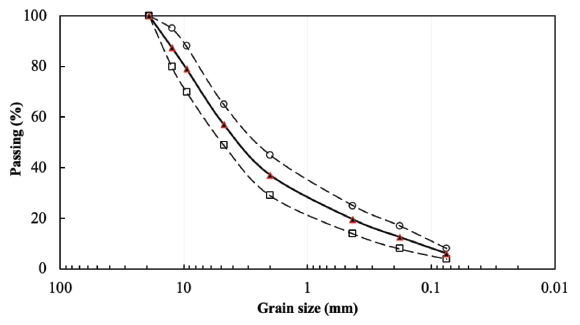 As depicted in the figure, the black lines out line the upper and lower limits of the particle size distribution, while the grey line represents the gradation curve used for the sample preparation. Regarding the additives, two commercial WMA additives were used in this research. The first addi tive is a conventional surfactant additive compo sed of amines, referred to in this study as the "G" product. The other one, denoted as a "K" product in this research, has a solid granular appearance at 25°C. Its melting point of 147°C facilitates rapid addition and adhesion into the asphalt. It is employed to enhance the rheological properties of both conventional and polymer-modified binders. According to the providers, the K product decrea ses viscosity at temperatures above 110°C. The recommended dosage oscillates between 2.00% and 3.00% by weight of the bituminous binder.