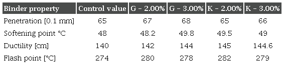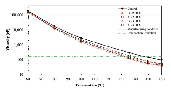 Table 4 shows the effects of WMA additives on the characterization properties of the bituminous bin der. According to the results, the penetration value slightly increased with adding the "G" product, while it remained almost constant with adding the "K" additive. In the same way, the WMA modified with additives increased the softening point, duc tility, and flash point properties. Although it was expected that with these modifiers, the viscosity was reduced and workability was improved, at these temperatures, the softening point tended to be higher because the microparticles tend to sti ffen the bitumen at these temperatures [18]. This phenomenon is clearly observed in figure 2. Visco sity is an indicator of the resistance to flow and its internal friction. The results show that the modi fied binders' viscosity is lower than the control binder as the temperature increases. Waxes have melting points inferior to the bituminous binder, which can become scattered during mixing. As the wax content increased, the viscosity decreased for higher temperature ranges. This phenomenon was observed equally in both additives.
