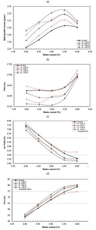 As depicted in figure 3a, the additives increa sed the bulk density of the mixture for the different bitumen contents. Regarding the VMA property, all mixes exhibited values greater than 15, the minimum suggested by Colombian norms for the wearing course. Concerning air voids pro perty, both additives led to a reduction as binder content increased, as observed in figure 3 c. The air voids ranged between 4.00 and 6.00% over a wide range of binder content, meeting the requirement of Colombian norms. Finally, VFA represents the voids in the mineral aggregate framework filled with bitumen. Consequently, the addition of the "K" product showed higher values than the con trol mixture, while in the case of "G'' product, the increment in this property was less noticeable.