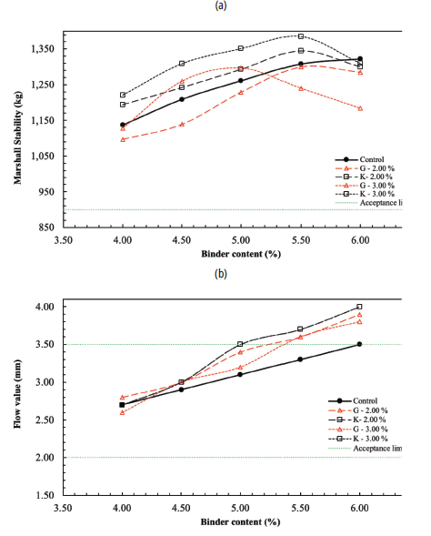 In compliance with Colombian regulations for designing dense-graded asphalt mixtures, bulk spe cific gravity, air voids, voids in the mineral aggre gate (VMA), voids filled with asphalt (VFA), Marshall stability, and flow value are the main parame ters used for quality control. Figure 3 displays the results regarding bulk density and volumetric pro perties. The black dotted lines indicate the limits set by Colombian regulations for high traffic levels.