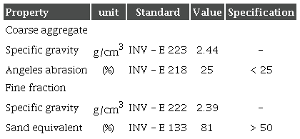 This study utilized conventional bitumen with a penetration grade of 60-70 to prepare specimens. Table 1 details the technical properties of the bin der. Siliceous aggregates, milled from river stone materials, were used as coarse and fine fractions, as well as filler material. The grading curve emplo yed in manufacturing the specimens followed the specifications of the National Roads Institute of Colombia (ÍNVIAS, by its acronym in Spanish), with a nominal maximum aggregate size of 19 mm intended for use as a wearing course in the asphalt pavement structure. Table 2 and figure 1 illustrates the properties and gradation curves employed in preparing samples.