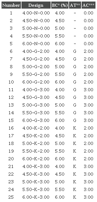 In the second phase, the warm additives were assessed at the asphalt mixture scale through the density, voids test, Marshall Stability (MS), and flow test procedure (INV - E - 748 - 07). The concept of the design of experiments (DOE) was considered to deal with the experimental designs. This tool was very useful in determining the total number of mixtures produced. The complete factorial design was taken into consideration, and the control variables were the binder content (4.00%-6.00%), the type of additive, either G, K, or no additive (N), and its additive content (2.00%-3.00%). Four repli cates per mixture design were performed to con duct the statistical analysis. Table 3 shows the set of 25 experimental designs considered for manu facturing and analysis.