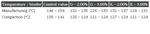 Based on the results of the viscosity curve, it was possible to determine the manufacturing and compaction temperatures of the bituminous mixtures. The manufacturing temperatura criterion yielded a viscosity value of 170 cP. The compaction temperatura was obtained for a value of 280 cP. Consequently, the range of manufacturing and compaction temperaturas can be observed in table 5.