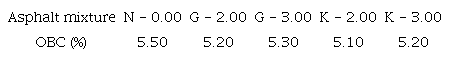 According to the results, the mixture without any additive displayed the highest OBC, followed by the mixes G - 3.00, K - 3.00, G - 2.00, and K - 2.00. Including warm additives can reduce binder con tent by 0.2 to 0.4%. More significant reductions were achieved with the "K" product instead of the "G" one. WMA with K additives notably increased the Marshall stability and bulk density and decrea sed the total air voids inside the mix.