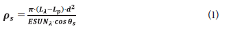 donde Lλ es la radiancia espectral medida por el sensor, Lp es la radiancia de la atmósfera (efecto bruma), d es la distancia Tierra-Sol en unidades astronómicas, ESUNλ es la irradiancia solar exoatmosférica y θS es el ángulo centital solar. El efecto bruma Lp está definido así: