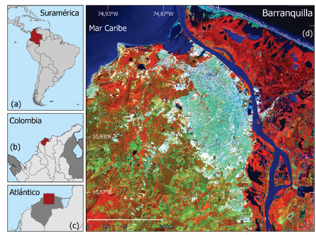 Con el objetivo de comparar el desempeño de los dos clasificadores mediante distintas estrategias para la obtención de las muestras de entrena miento, se seleccionó una zona de 30 x 30 km en el Área Metropolitana de Barranquilla (AMB). Esta área está delimitada por las latitudes 10,82° N y 11,09° N, así como las longitudes 74,68° W y 74,96° W. Según informes oficiales, Barranquilla cuenta con una población de 2,7 millones de habitantes y se clasifica como la cuarta área metropolitana más grande de Colombia [24]. La ciudad se encuentra en el delta del río Magdalena, en la costa del mar Caribe (figura 1). Este río, que atraviesa Colombia de sur a norte, es considerado la principal arteria fluvial de la nación. Barranquilla es el epicentro del AMB y la principal ciudad del caribe colombiano, tanto en términos demográficos como económi cos [25]. Los principales ecosistemas naturales en el área de estudio son el bosque tropical seco, el río Magdalena y los manglares estuarinos [26]. El uso del suelo es principalmente urbano y de con servación forestal. Por sus fronteras naturales, el crecimiento del AMB está restringido al suroeste de Barranquilla.