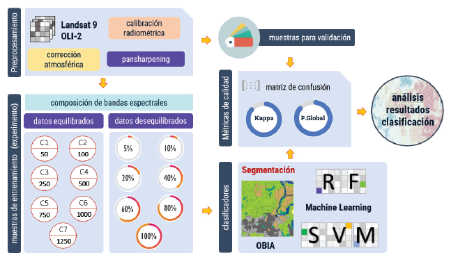 Se han llevado a cabo varios estudios con el objetivo de encontrar el algoritmo de clasifica ción ideal para la creación de mapas LULC. Estos estudios implican comparar el rendimiento del algoritmo consigo mismo y en relación con otros métodos de clasificación; sin embargo, las conclu siones varían considerablemente [20], [21]. Yuh et al. [22] sostienen que los algoritmos ML se pueden entrenar utilizando conjuntos de datos equilibra dos (con el mismo número de píxeles muestreados por clase) y desequilibrados (con diferente número de píxeles muestreados para cada clase) sin gran des incertidumbres de clasificación. Por otro lado, Azadbakht et al. [23] han indicado que los conjun tos de datos desequilibrados pueden plantear desa fíos para los algoritmos de ML, especialmente en la categorización de las clases menos frecuentes. Esto sugiere que los conjuntos de datos desequilibrados todavía presentan desafíos significativos que deben abordarse adecuadamente en el entrenamiento de algoritmos ML. Existe poca investigación que com pare RF y SVM en el contexto de imágenes Land-sat-9, especialmente en Colombia. Si bien el diseño de muestreo está bien documentado en la litera tura, quedan dudas sobre el número y tamaño de muestras requeridas, su calidad y el desequilibrio de clases.