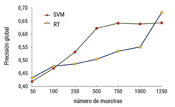 Este estudio analizó el desempeño de dos mode los de aprendizaje automático en la clasificación LULC basada en objetos utilizando una imagen L9 OLI-2. La figura 3 muestra la precisión general (OA) de los algoritmos evaluados en relación con el tamaño de la muestra para grupos equilibrados. En general, se observó un aumento en la precisión de ambos clasificadores a medida que aumentó la cantidad de píxeles de entrenamiento para la cla sificación. Ambos métodos de clasificación mos traron su mayor precisión al emplear conjuntos de 1250 muestras mientras que la precisión más baja se registró con conjuntos de 50 muestras. Sin embargo, cada clasificador respondió de manera diferente al aumento del tamaño de la muestra. La clasificación de SVM alcanzó una precisión general del 64 % a partir de conjuntos con 750 muestras, aunque, la estabilidad de este clasificador parece lograrse a partir de 500 muestras con una precisión global de 62 %. Desde 100 a 1000 muestras, el clasi ficador RT presentó un comportamiento casi lineal de incremento continuo, pero, con un crecimiento porcentual bajo del 7 %. No obstante, alcanzó su máxima precisión de 68 % con 1250 muestras que superan en 4 puntos porcentuales a SVM.