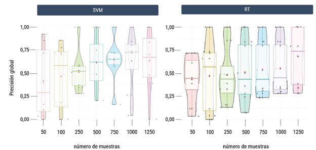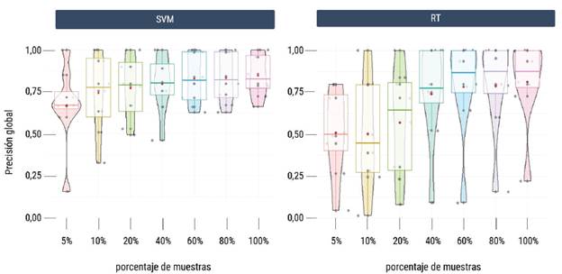 La figura 6 ilustra la distribución individual de los datos muestreados para cada clasificador y porcentaje de muestra mediante gráficas de violín. Resulta notable que en el muestreo del 5 % de los datos de SVM hubo una alta densidad alrede dor de la media. Esto indica que espectralmente las muestras tuvieron valores cercanos entre sí, lo cual no es representativo de la población general y se evidenció a través del menor grado de precisión general obtenido. Las distribuciones de datos del 60 %, 80 % y 100 % presentaron un tamaño cercano al cuerpo del violín, lo cual indica homogeneidad en sus distribuciones y sugiere estabilidad en el rendimiento del modelo SVM. Las cajas del rango intercuartílico (IQR) del clasificador RT fueron sig nificativamente más alargadas en comparación con las de SVM. La menor variabilidad en las pre dicciones del clasificador SVM, evidenciada por las cajas del IQR más cortas, señala una consistencia sobresaliente en las predicciones de este modelo. Ambos clasificadores parecen ser buenos genera lizadores, ya que diferentes conjuntos de entrena miento del mismo tamaño produjeron precisiones similares.