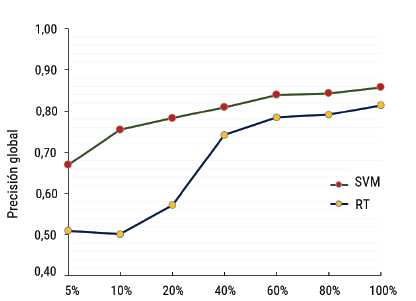 En la figura 5 se presenta el desempeño de los cla sificadores con datos desequilibrados, evaluado mediante la precisión global (OA). En todos los niveles de remuestreo, se observó que SVM siempre produjo resultados de mayor precisión en compara ción con RT. Sin embargo, las tres precisiones más altas obtenidas por ambos clasificadores variaron ligeramente entre sí. Los resultados de precisión del SVM no alcanzaron diferencias significativas entre los tamaños de muestra de entrenamiento del 60 %, 80 % y 100 % con valores de 0,84, 0,84 y 0,86 res pectivamente. Por su parte, RT alcanzó valores de 0,78, 0,79 y 0,81 sobre el mismo muestreo. En los conjuntos de entrenamiento del clasificador SVM se evidenció un comportamiento casi lineal entre los tamaños de muestra del 10 % al 100 %. Esto significa que, al incrementar la cantidad de mues tras de entrenamiento, el rendimiento del modelo mejora de manera predecible y constante. A través del comportamiento general de SVM, se interpreta que con un tamaño de muestra del 60 % se obtienen resultados consistentes de alta precisión, lo que indica que no es necesario aumentar el tamaño de las muestras para mantener un rendimiento óptimo.