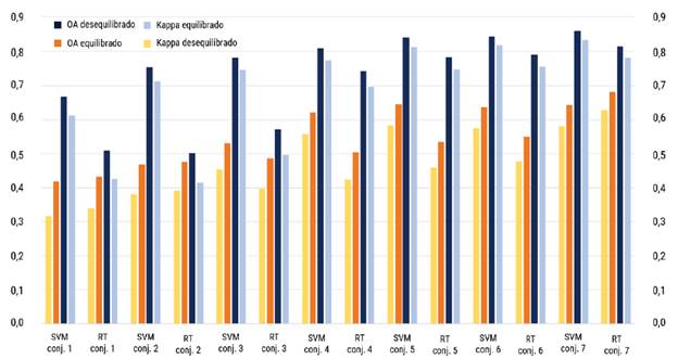 En este sentido, nuestros datos reportaron que RT en los conjuntos 5, 6 y 7 de la figura 7 (muestreos de 60 %, 80 % y 100 %) no presentaron diferencias significativas frente a la OA. Esto podría implicar que el modelo alcanzó su capacidad máxima de aprendizaje con el 60 % de los datos y agregar más datos no resultó en un aumento importante de su precisión general. A pesar de que se presentaron diferencias en el rendimiento entre conjuntos de datos de entrenamiento equilibrados y desequili brados para ambos algoritmos, la precisión demos tró ser consistentemente superior en el caso de SVM en comparación con RT. La homogeneidad tanto en las muestras de entrenamiento como en las de vali dación se identificó como un factor crítico para la estabilidad en el rendimiento de los modelos, esta tendencia estuvo respaldada por la precisión global (OA) y el índice Kappa.