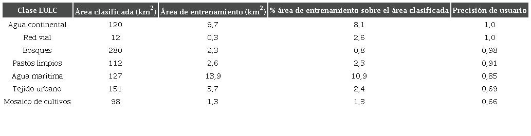 La variación de los porcentajes del área de entre namiento entre las cubiertas de agua continental (8,1 %), red vial (2,6 %) y bosques (0,8 %), todas con una precisión de usuario muy alta, resulta interesante y puede atribuirse a la complejidad inherente de estas clases. Es posible que existan variaciones naturales significativas en las caracte rísticas del agua, como profundidad, turbulencia y características del lecho, que requieren un área de entrenamiento más grande para capturar estas variaciones. Por otro lado, las características de las carreteras, como color, textura y forma, podrían ser más homogéneas y fáciles de aprender para el modelo, lo que explicaría por qué se necesita un área de entrenamiento menor. La clase bosque, a pesar de tener un porcentaje de área de entrena miento baja, logró una alta precisión de usuario del 98 %. Las áreas de bosque a menudo presentan una mayor heterogeneidad espacial, lo que puede proporcionar una gama más amplia de firmas espectrales en un área relativamente pequeña, permitiendo así un mejor aprendizaje con menos datos de entrenamiento. El tejido urbano y los mosaicos de cultivos pueden ser muy heterogéneos en términos de estructuras, patrones y materiales. En áreas urbanas hay una gran variabilidad en materiales y tipologías constructivas. De manera similar, los mosaicos de cultivos pueden incluir diferentes tipos de cultivos con características espectrales disímiles. Estas clases necesitan con siderar áreas más amplias de entrenamiento para representar mejor sus características.