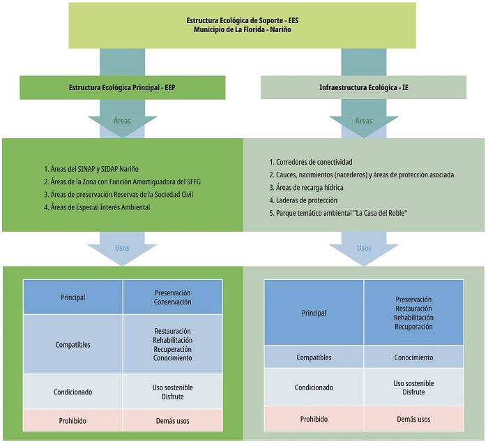 En el municipio de La Florida, Nariño1, objeto del presente estudio de caso, se realizó la revisión y ajuste del esquema de ordenamiento territorial municipal (EOT), según los lineamientos del Decreto 3600 de 2007, que reglamenta las determinantes de ordenamiento del suelo rural en Colombia. Se requiere establecer la Estructura Ecológica Principal (EEP) como el “conjunto de elementos bióticos y abióticos que dan sustento a los procesos ecológicos esenciales del territorio, cuya finalidad principal es la preservación, conservación, restauración, uso y manejo sostenible de los recursos naturales renovables, los cuales brindan la capacidad de soporte para el desarrollo socioeconómico de las poblaciones” 1, conceptualización basada en la propuesta de van der Hammen y Andrade 2.