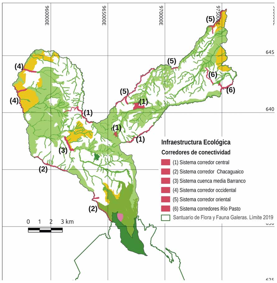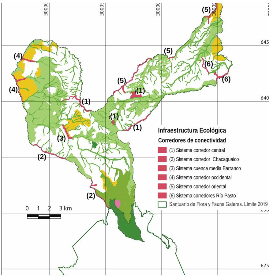 La IE contiene elementos complementarios a la EEP, construidos o transformados de forma notoria por intervención antrópica, que prestan se y que soportan el desarrollo socioeconómico y cultural de la población en el territorio. Dentro de estos elementos se encuentran: zonas de recarga hídrica (divisoria Guáitara-Juanambú), las franjas de protección hídrica (FPH), que incluyen las rondas hídricas, cauces, nacederos y áreas de protección asociadas, laderas de protección y el parque temático ambiental “La casa del roble” (figura 9) y corredores de conectividad (figura 10).