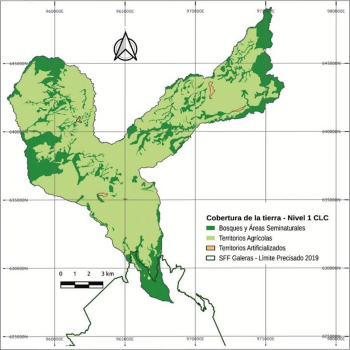 Coberturas de la tierra y áreas de uso humano directo: determinadas mediante imágenes satelitales, levantamiento en campo y procesamiento con herramientas de sistemas de información geográfica (software QGIS 2.18.18) 10 y la clasificación CORINE Land Cover (CLC) adaptada para Colombia 11.