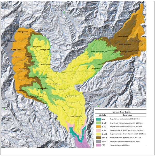 Las coberturas boscosas subsistentes contrastan con las zonas de vida (figura 5), que muestran que las condiciones del territorio son apropiadas para los ecosistemas de bosques húmedos montanos, bosques secos y páramos subandinos.