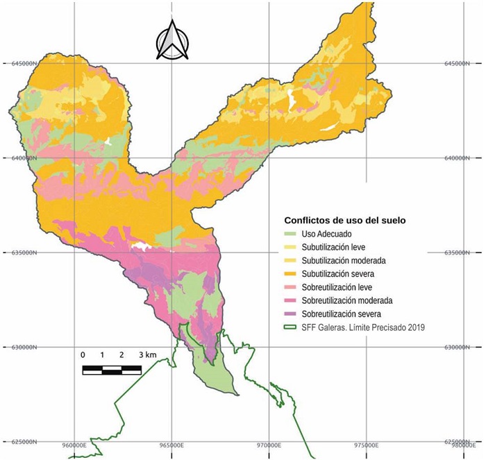 Conflictos en los usos del suelo: las zonas en conflicto se obtuvieron mediante la sobreposición de mapas (vocación del suelo, coberturas vegetales y uso humano directo del suelo) con el software QGIS 2.18.18 10.