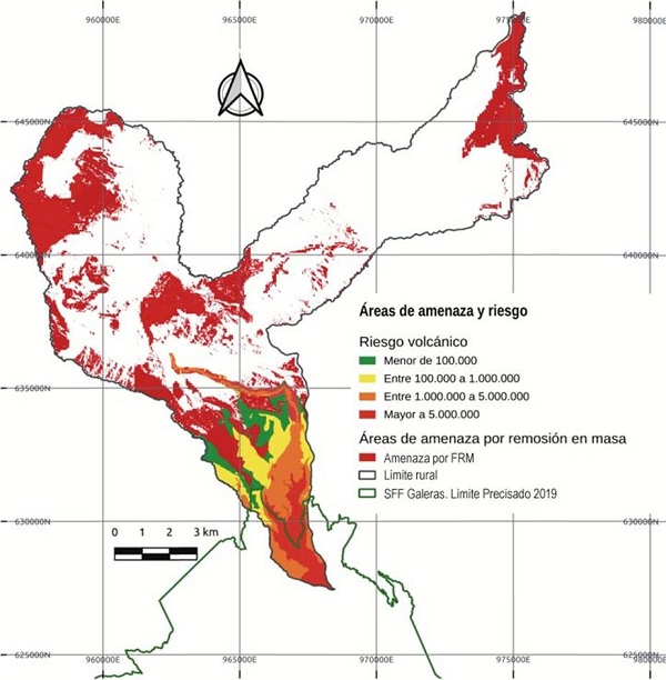 Se delimitaron las áreas en condición de amenaza y riesgo mediante estudios específicos de cada tema: severidad volcánica ponderada, amenazas por movimientos en masa, por inundaciones, por avenidas torrenciales y por incendios forestales. Asimismo, se realizó un estudio de zonificación de riesgo volcánico para edificaciones y riesgo volcánico por predios (figura 7).