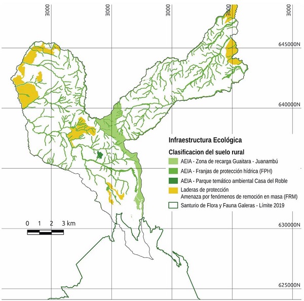 La EES permitió duplicar las áreas de conservación y protección ambiental hasta el 56,02 %, mediante la inclusión de la IE, compuesta por corredores de conectividad, cauces, nacimientos y áreas de protección asociada (FPH), áreas de recarga hídrica, laderas de protección y el parque temático ambiental “La casa del roble”. El uso principal de la IE es la preservación, restauración, rehabilitación y recuperación de espacios naturales que han sido moderada o altamente transformados. Otros usos de la IE son el conocimiento, como uso compatible y el uso sostenible y el disfrute como usos condicionados.