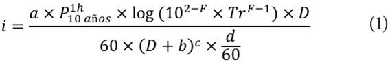 En el modelo se aplicaron como variables de entrada las intensidades de lluvia basadas en el tiempo de concentración y determinadas a partir de curvas I-D-F, mediante el método presentado por Chen (1983) 14 (ecuación 1), junto con la evapotranspiración potencial calculada con base en el método de Thornthwaite 15.