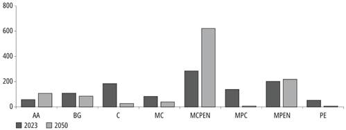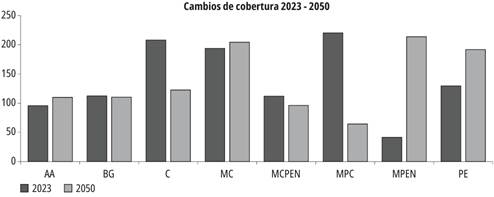 Con base en los hallazgos previos se llevó a cabo una proyección inicial al año 2050. Esta se basó en los ajustes de coberturas territoriales correspondientes al año de 2023, considerando las tendencias y cambios identificados, y propendiendo por incorporar coberturas con un componente arbóreo en los sistemas identificados. En la tabla 7 y la figura 5 se presentan los resultados obtenidos en esta proyección prospectiva.