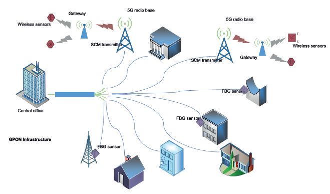 Figure 1 illustrates the envisioned environment of the city, where the existing fiber infrastructure is utilized as a platform to provide transport for fixed end users, optical sensors, and wireless sensor radios deployed in various localities. The end users include residential, commercial, governmental, healthcare, and educational institutions. Optical sensors based on (FBG) are used for monitoring the deformation of civil structures such as bridges, buildings, and electricity distribution towers, among others. Wireless sensor radios include technologies such as zigBee, LoRa, WiFi, operating in the 915 MHz, 2.4 GHZ or 5.8 GHZ frecuency bands. In this context, the SCM transmitter facilitates the transport of wireless sensor radios from the 5g-radio base station to the central office.