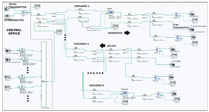 The second part of the architecture was developed in the Optisystem software. Understanding Bogotá's GPON architecture was crucial in determining the dimensions; specifically the length of the entire system. Based on this, potential locations were selected for each of the 26 FBGS, and a complete architectural structure was created, factoring in the positions of the 24 antennas and the 26 FBGS. Five simulations were then conducted, one for each locality, as the complexity of the final architecture made simulating all localities simultaneously a challenge in terms of software resources.