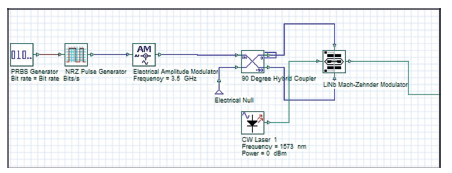 The integration of the two parts, -the multi coverage study design in Xirio Online and the fiber optic architecture design in Optisystem - was made possible by the SCM technique, which directly modulates the RF signal onto an optical carrier. Figure 3 illustrates an SCM transmitter for a single -sideband optical modulation. The optically intensity-modulated signal is transmitted through the optical fiber link and multiplexed with the reflected signal from the FBG in the uplink.