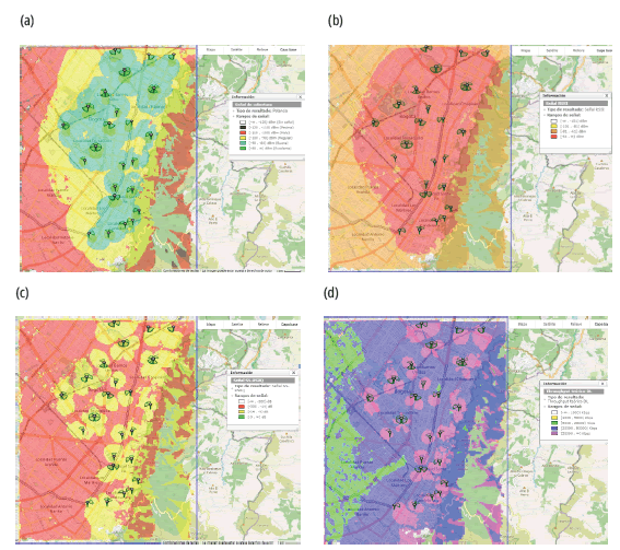 From these results, it can be inferred that the coverage area, i.e., the radiated zone, will maintain at least -100 dBm of power. Given that the sensitivity of an average receiver is around -110 dBm, this ensures effective communication in the downlink direction. Regarding the RSSI, the study shows that the localities analyzed have a power level exceeding -61 dBm, indicating a good signal strength. In the range between -40 dBm and -60 dBm, a connection efficiency of about 80% is achieved.