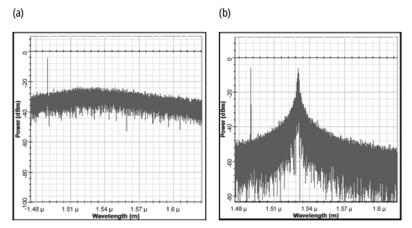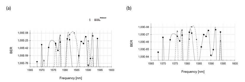 Next, to evaluate the architecture's capacity, tests were conducted using both a wideband interrogator with a spectral width of 10 THZ centered at 1530 nm and a narrowband interrogator with a spectral width of 100 GHZ, also centered at 1530 nm, as illustrated in Figure 5. Specifically, Figure 5(a) shows the wideband interrogation signal multiplexed with the GPON carrier at 1490 nm, and Figure 5(b) shows the narrowband interrogation signal similarly multiplexed with the GPON carrier. The objective was to analyze the over-dimensioning of the interrogation system, particularly in the wideband case, and compare how this affects the Bit Error Rate (BER), which indirectly reflects the communication channel's efficiency.