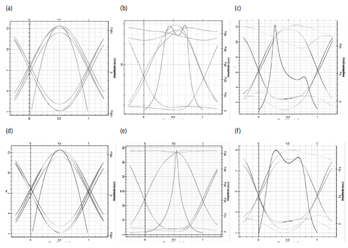 Figures 7(d), 7(e) and 7(f) show the signal quality at the same measurement points but using a narrowband interrogator instead. As observed, the eye diagrams reinforce the results depicted in Figure 6, higlighting the degradation associated with the interrogator and propagation lengths. Overall, the three scenarios operating with both interrogation systems exhibit acceptable values in terms of BER tolerance and eye diagram openings.