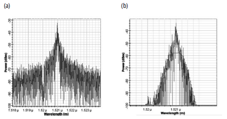 For instance, Figure 8(a) shows the notch produced by a FBG sensor tuned to 1520 nm on the interrogation signal of nearby FBG sensor tuned to 1521 nm. Figure 8(b) illustrates the FBG reflection in the uplink. While the optical power of the component reflected by the FBG sensor is -32 dBm, its optical power at the central office is -34 dBm. This 2 dB power difference implies a good spectral quality, suitable for detecting picometer variations, which are typical in FBG- based optical sensors.