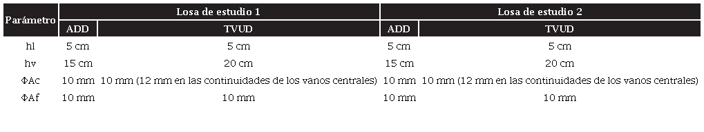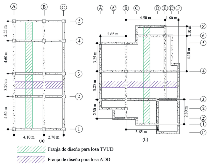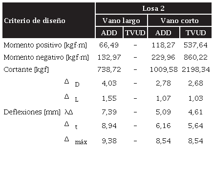 El diseño de la losa ADD se realizó en consideración de los paños críticos (superficies en las que se tienen las mayores condiciones de carga). En el caso del sistema TVUD, los cálculos se hicieron como una viga convencional de la sección T, respecto a una franja paralela al lado corto del sistema. En la figura 5 se indican los paños y franjas establecidas para este análisis. Los resultados de los cálculos se resumen en la tabla 3, en la que se describe el armado de acero empleado para satisfacer las solicitudes de momento flector en las viguetas de las losas.
