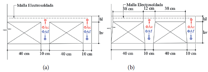 En el levantamiento de información en obra, se identificó que los sistemas de losa tipo ADD se construirán utilizando diferentes alivianamientos. En el primero se emplearán bloques de EPS, mientras que en el segundo se utilizarán bloques pómez. Sin embargo, en este estudio se consideraron los bloques de EPS para el diseño del sistema TVUD, con el que se realizó la comparativa. Esta elección se justifica por su adecuado ajuste a la geometría de la losa y por ser los materiales más usados en el sector de la construcción a nivel local, gracias a sus atributos de reutilización y a la facilidad de manipulación durante las labores. Los sistemas de losa que fueron objeto de análisis se indican en la figura 5.